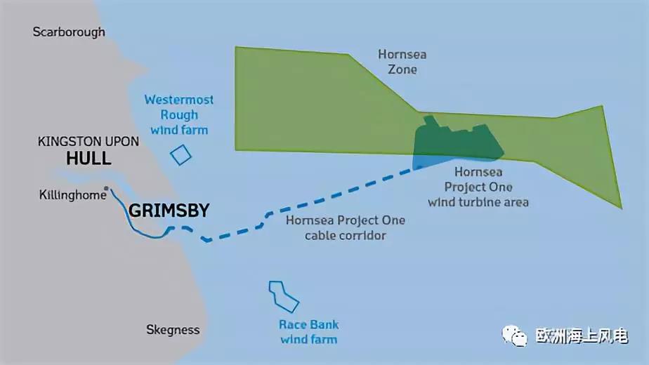 由沃旭能源開(kāi)發(fā)的HornseaOne項(xiàng)目位于英國(guó)約克夏郡以東120km的海域,總裝機(jī)容量1218MW,共安裝174臺(tái)西門子SWT-7.0-154風(fēng)機(jī),預(yù)計(jì)在2020年投運(yùn),屆時(shí)將成為世界上最大的海上風(fēng)電場(chǎng)。