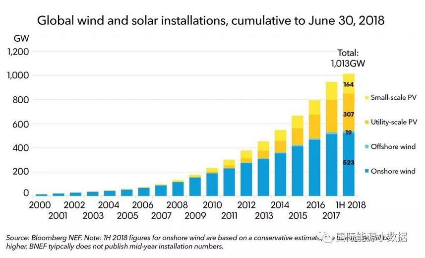 根據(jù)彭博新能源財(cái)經(jīng)(BNEF)匯總的數(shù)據(jù),至2018年6月底止全球風(fēng)電、光伏的累計(jì)裝機(jī)容量達(dá)到1,013吉瓦,超過(guò)了1,000吉瓦(1 TW)的里程碑。BNEF預(yù)計(jì)到2023年全球風(fēng)電、光伏將再凈增1,000吉瓦,屆時(shí)總裝機(jī)容量將達(dá)2,000吉瓦。