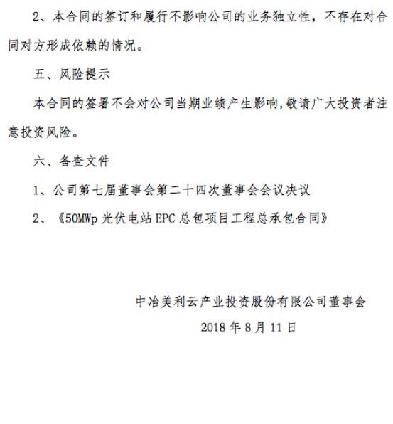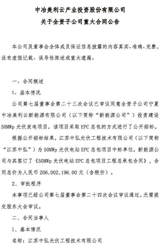 2018年8月10日晚,美利云(000815)公告稱,公司全資子公司寧夏中冶美利云新能源有限公司(以下簡稱“新能源公司”)投資建設(shè)50MWp光伏發(fā)電項目,該項目采取EPC總包的方式進行了公開招標。