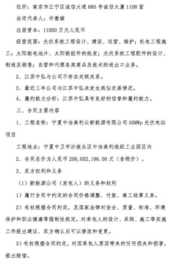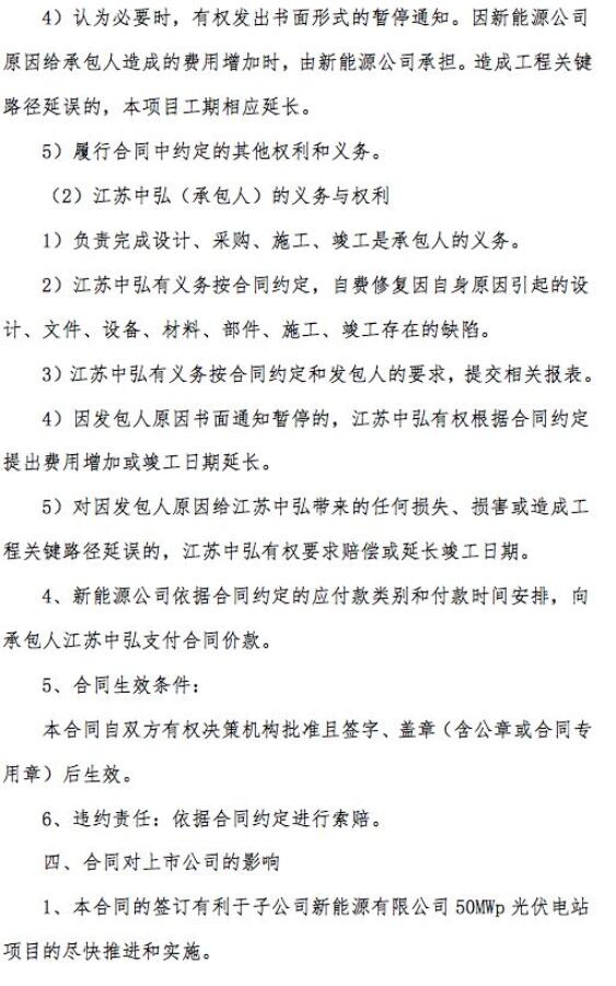 根據(jù)公開招標結(jié)果,江蘇中弘光伏工程技術(shù)有限公司為50MWp光伏電站EPC總包項目中標單位,新能源公司與其簽訂了《50MWp光伏電站EPC總包項目工程總承包合同》,合同總價為人民幣2.06億元(含稅價)。折合單價約為4.12元/瓦。