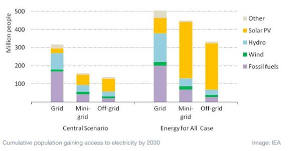 在“全民能源”情景中,國(guó)際能源署新的地理空間分析表明,到2030年為全球13億人提供通用電力(包括預(yù)計(jì)人口增長(zhǎng)),微型電網(wǎng)將成為4.5億人提供電力的最便宜技術(shù),其中三分之二生活在撒哈拉以南非洲地區(qū)。