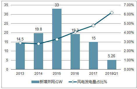 2018 年 Q1 我國風(fēng)電新增并網(wǎng) 5.26GW,同比增長 49.4%,發(fā)電量 978 億度,同比提升 39.1%,占總發(fā)電規(guī)模的 6.2%。利用小數(shù) 592 小時(shí),相比同期提升 124 小時(shí)。棄風(fēng)率降至 8.5%,同比下行 8 個(gè)百分點(diǎn),限電改善顯著