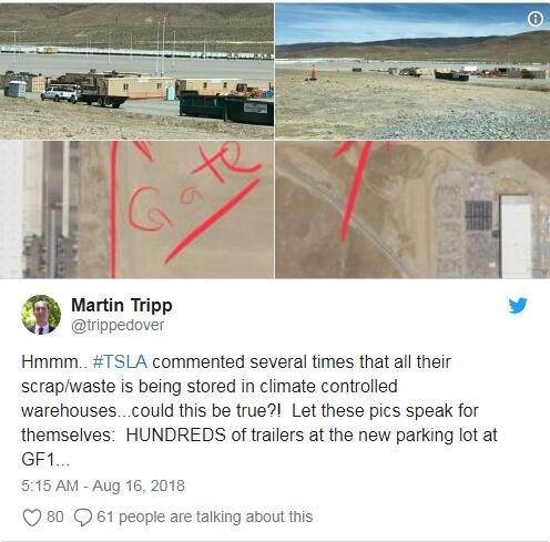 特里普還發(fā)布推文,聲稱特斯拉將廢物或廢料存放在超級工廠的開放式停車場和卡車上,而不是溫度控制的倉庫。為了證明真實(shí)性,他還貼出了工廠大量廢物的截圖。