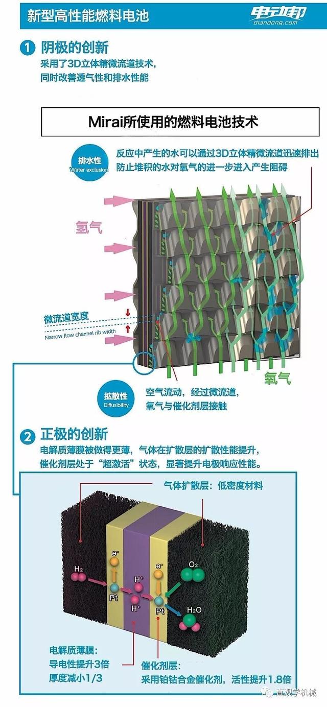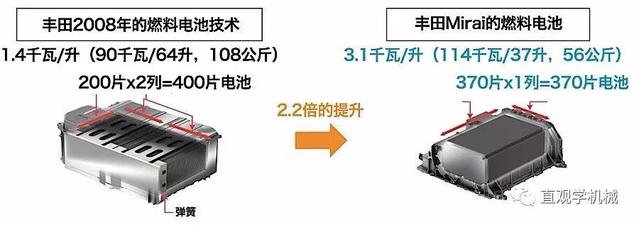 豐田Mirai搭載的燃料電池堆棧是由370片薄片燃料電池組成的,因此被稱為“堆!保还部梢暂敵114千瓦的發(fā)電功率。此前我們也分析了大眾集團(tuán)的燃料電池技術(shù),結(jié)構(gòu)基本類似。豐田的燃料電池堆棧經(jīng)歷了十幾年的技術(shù)優(yōu)化,形成了自己的特色結(jié)構(gòu),比如3D立體微流道技術(shù),通過更好地排出副產(chǎn)物水,讓更多空氣流入,有效改善了發(fā)電效率。所以整個堆棧的發(fā)電效率達(dá)到了世界先進(jìn)水平,達(dá)到了3.1千瓦/升,比2008年豐田的技術(shù)整整提升了2.2倍。