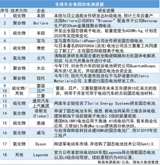以下是全球18家車企固態(tài)電池研發(fā)進(jìn)展:
