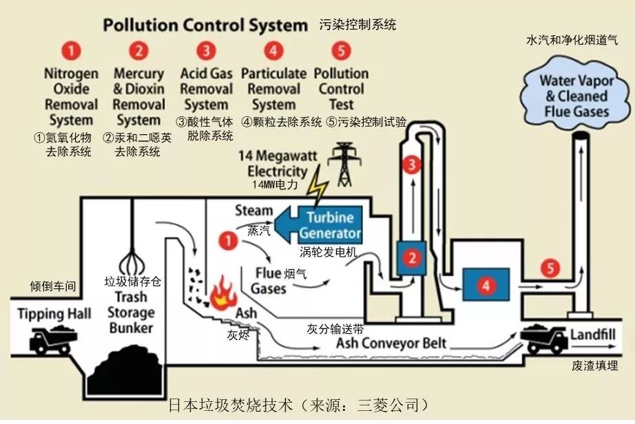 日本的垃圾處理技術主要包括生產廢棄物固體燃料以及垃圾生物降解,80%的生活垃圾通過焚燒處理,填埋僅占1.3%,其它部分通過破碎、分選等方式處理。日本是目前生活垃圾焚燒技術最先進的國家,垃圾焚燒廠的數量位居世界第一,焚燒爐型主要有爐排爐(下圖是以三菱公司為代表的焚燒技術路線)、流化床焚燒爐和氣化熔融爐。