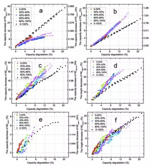 根據(jù)上面的數(shù)據(jù),YangGao認(rèn)為PEarea I和 NEpeak III的容量,以及NEpeak II的高度代表鋰離子電池內(nèi)的活性Li損失,PEarea II容量主要代表了正極的活性物質(zhì)損失,NEpeak I的高度和容量主要反應(yīng)了負(fù)極活性物質(zhì)的損失。