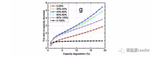 鋰離子電池在不同的SoC范圍內(nèi)循環(huán)的數(shù)據(jù)如下圖所示,為了對比20%DOD和100%DOD放電深度的電池的循環(huán)性能,作者將5次20%DOD循環(huán)作為一個等效循環(huán)(整體放電容量相當(dāng)于100%DOD),從下圖中能夠看到在循環(huán)中衰降速度自快而慢分別為[80%,100%]>[20%, 40%]>[40%, 60%] ≈[60%, 80%] > [0, 20%],中間的三個SoC范圍在衰降速度上是非常接近的。100%DOD和80%SoC-100%SoC循環(huán)的電池容量衰降速度要顯著快于其他20%DOD循環(huán)的電池。