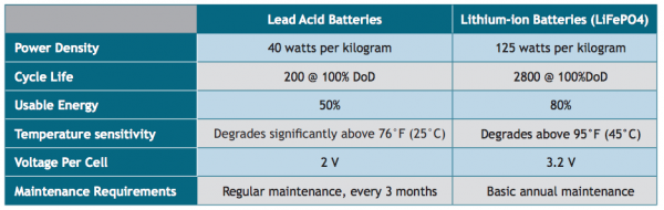 下表比較了鉛酸蓄電池與鋰離子電池的性能(以磷酸鐵鋰電池為例):