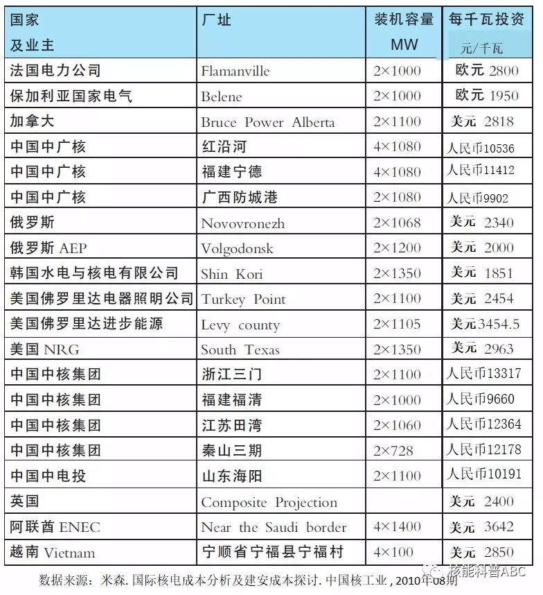 參考: (非專業(yè)人士可以跳過這些小字) 這個估算與下表所顯示的不同國家不同項(xiàng)目的每千瓦的成本比較的話,是相對比較保守的。根據(jù)文獻(xiàn)來源作者的表述,下表顯示的成本是:不包括設(shè)計(jì)變更引起的材料和人工成本增加及通漲造成的費(fèi)用增加,在設(shè)計(jì)無大的變更、工期無拖延、經(jīng)濟(jì)形勢無大的波動條件下的預(yù)算成本。