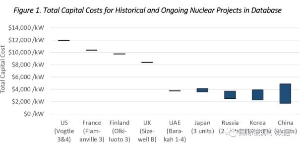 根據(jù)英國能源技術研究所(Energy Technologies Institute)匯總了近年來美國、法國、芬蘭、英國、阿聯(lián)酋、日本、俄羅斯、韓國、中國核電投資成本,制作了下面的圖表。