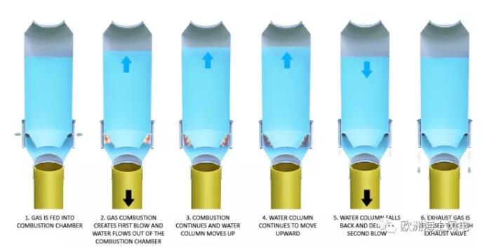 BlueHammer內(nèi)部結(jié)構(gòu)主要可分為上部蓄水桶和下部燃燒室,當(dāng)設(shè)備就位于單樁之上后,首先向打樁錘內(nèi)注水,并充滿(mǎn)整個(gè)燃燒室和部分蓄水桶,整個(gè)注水過(guò)程小于10分鐘;隨后向燃燒室內(nèi)注入混合燃燒氣體,并點(diǎn)燃引爆,其內(nèi)部爆破沖擊力通過(guò)燃燒室內(nèi)的水傳遞給單樁,同時(shí)抬升蓄水桶內(nèi)的水位;最后上部蓄水桶內(nèi)的水回落,再次撞擊底部單樁。