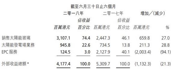 由于光伏531新政的出臺(tái),中國(guó)光伏需求大幅縮減,全球市場(chǎng)環(huán)境皆受到重大影響,信義光能2018上半年綜合收益4177.4百萬(wàn)港元,同比減少21.3%。其太陽(yáng)能玻璃銷售及太陽(yáng)能發(fā)電業(yè)務(wù)收益則同比2017年增長(zhǎng)27.0%和28.8%,EPC收益大幅縮水,綜合收益僅占全部收益的3%。