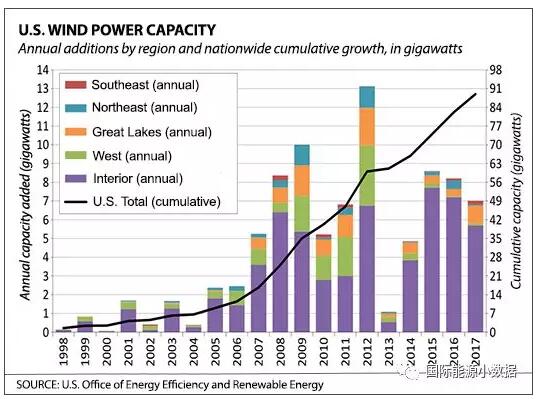 ——2017年美國風(fēng)電投資110億美元,新增裝機(jī)7,017兆瓦,占當(dāng)年新增發(fā)電裝機(jī)的25%(次于光伏、天然氣列第3位);年底風(fēng)電總裝機(jī)容量達(dá)到88.973吉瓦,排在世界第2位(次于中國188.392吉瓦);風(fēng)電占美國電力消費(fèi)的7%(全球平均5%)。