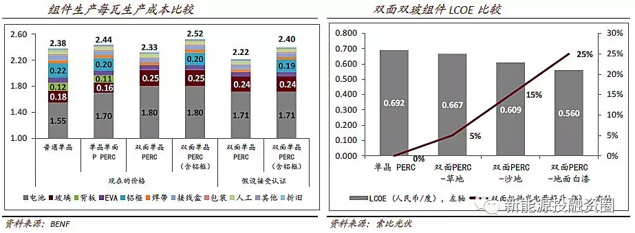 提升效率進一步降低成本。根據(jù)天合以及華東理工的測試數(shù)據(jù),使用雙面雙玻組件在不同地面的發(fā)電增效在5-27%左右,其中草地僅增加5%,而地面白漆將增加25%-27%的發(fā)電量。考慮到目前P 型PERC 有量產(chǎn)化數(shù)據(jù),我們以P 型PERC電池轉(zhuǎn)雙面電池進行計算每1%的發(fā)電效率提升也將帶來人民幣5 厘的度電成本下降(相比現(xiàn)在下降0.7%)。而如果我們將發(fā)電量轉(zhuǎn)成每個組件的瓦數(shù)提升(也就是320瓦的組件,5%效率帶來16 瓦的提升,相當(dāng)于上升1.1%轉(zhuǎn)化效率),則雙玻雙面組件成本將進一步下降4 分/瓦(5%)。如果不使用鋁框的雙玻雙面組件,即使不考慮瓦數(shù)提升,因為減少了鋁的使用,每瓦成本也將下降11 分/瓦。