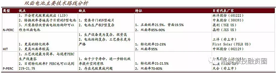 從我們和組件企業(yè)交流來看,批量投產(chǎn)的意愿在加強,主流組件企業(yè)積極推廣雙玻產(chǎn)品,技術(shù)逐步成熟與良品率提升帶動雙玻組件成本下降。在去年6 月的Intersolar 歐洲光伏展上,隆基股份將雙面雙玻組件作為主推新產(chǎn)品之一,并且公司總裁李振國接受采訪時表示,公司計劃在2 年內(nèi)使p 型單晶PERC 雙面雙玻組件成為公司主流產(chǎn)品。2018 年僅隆基一家就將新增3.5GW 的雙面雙玻組件產(chǎn)能。但在選擇技術(shù)方向上,目前主流廠家存在較大的分歧。晶科,英利,阿特斯等一線企業(yè)均已推出自己的雙玻雙面產(chǎn)品,其中我們看到以隆基,晶澳和天合為主的企業(yè)主要推進P 型PERC 的雙面雙玻產(chǎn)品,而以英利,晶科和林洋為主的企業(yè)主要推動N 型PERC 的雙面雙玻產(chǎn)品,另外如中環(huán)股份,第一太陽能等企業(yè)則側(cè)重在HIT(異質(zhì)結(jié)層電池)上。從3 個的優(yōu)劣來看,目前P 型PERC 雙面雖然雙面率最低,轉(zhuǎn)化效率也最低,但是是目前最快達到量產(chǎn)化的產(chǎn)品。N 型PERC 雙面轉(zhuǎn)化效率介于兩者之間,但是量產(chǎn)化之后成本下降有待驗證。(林洋N 型電池已經(jīng)成功量產(chǎn),公司預(yù)計其生產(chǎn)成本將與傳統(tǒng)P 型PERC 接近)而HIT 技術(shù)雖然整體的效率最高,但是由于其晶硅電池表面需要再添加非晶硅薄膜,因此量產(chǎn)化之后成本一直較高,因此需要進一步的生產(chǎn)技術(shù)突破或優(yōu)化。
