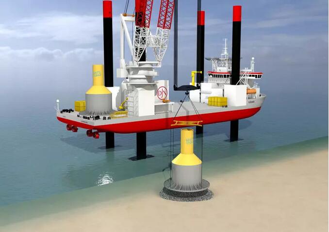 基礎(chǔ)安裝前需要平整海底,再安裝重達(dá)500噸的中空基礎(chǔ)。基礎(chǔ)安裝時(shí)采用Synchoist負(fù)載定位系統(tǒng),并使用美國(guó)恩派克千斤頂技術(shù),確;A(chǔ)保持絕對(duì)的垂直狀態(tài),也避免破壞水平的海床,有利于后續(xù)塔筒和風(fēng)機(jī)的安裝。