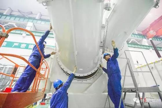 吊裝余量僅有17厘米,需要全組人員默契配合,上面的人盯緊殼體不發(fā)生磕碰,下面的人則要確保器身凸點精準(zhǔn)對位。黃曉鵬他們已經(jīng)能做到一氣呵成,器身吊裝入位只需要30分鐘。