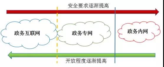 政務(wù)大數(shù)據(jù)在網(wǎng)絡(luò)結(jié)構(gòu)上分為互聯(lián)網(wǎng)、政務(wù)外網(wǎng)(專網(wǎng))和政務(wù)內(nèi)網(wǎng)三個主要的安全域,政務(wù)互聯(lián)網(wǎng)和政務(wù)專網(wǎng)邏輯隔離,政務(wù)內(nèi)網(wǎng)和政務(wù)專網(wǎng)物理隔離。從政務(wù)互聯(lián)網(wǎng)到政務(wù)專網(wǎng),再到政務(wù)內(nèi)網(wǎng),安全保密要求逐漸提高;反之,從政務(wù)內(nèi)網(wǎng)到政務(wù)專網(wǎng),再到政務(wù)互聯(lián)網(wǎng),信息和數(shù)據(jù)開放程度逐漸提高。