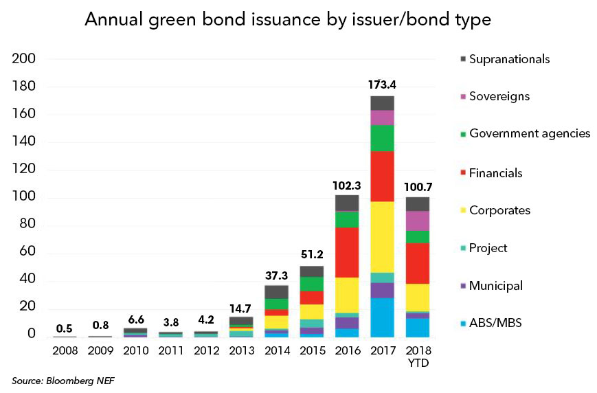 據(jù)彭博社新能源財(cái)經(jīng)最近發(fā)布的數(shù)據(jù),截至目前,2018年全球綠色債券發(fā)行量達(dá)到1007億美元,這已是連續(xù)第三年突破1000億美元發(fā)行量。