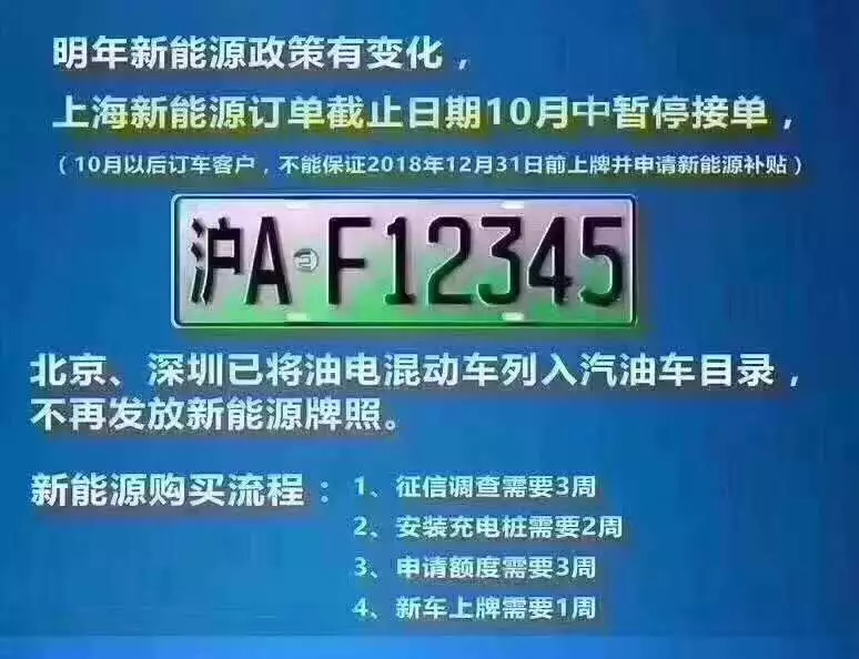 圖片上稱,“明年新能源政策有變化,上海新能源訂單截止10月暫!钡南⒃诰W(wǎng)絡(luò)上廣泛傳播。消息稱,不能保證10月以后在上海購買新能源汽車的用戶,在2018年12月31日前上牌、取得補(bǔ)貼。