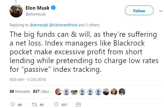 而最新推文顯示,馬斯克不但繼續(xù)抨擊空頭,還將矛頭對準(zhǔn)了貝萊德這樣的華爾街巨頭。他在周五的一條推文中說:貝萊德這樣的指數(shù)管理機(jī)構(gòu)一邊通過為做空融券賺取暴利,一邊還假裝為追蹤被動指數(shù)收取低費(fèi)率。