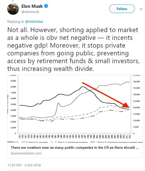 周五另一條推文中,他轉(zhuǎn)發(fā)了Business Insider文章中顯示美國上市公司數(shù)量明顯減少的圖表,評論稱,做空不止是影響市場的行為,對經(jīng)濟(jì)也有凈負(fù)面的影響,給GDP帶來負(fù)面影響。它還讓私營企業(yè)對上市望而卻步,讓養(yǎng)老基金和小投資者失去了增加投資收益的渠道。