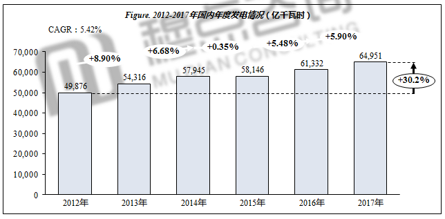 2017年,全國(guó)共計(jì)發(fā)電64951億千瓦時(shí),比上年增長(zhǎng)5.9%,增速比上年加快0.4個(gè)百分點(diǎn),近兩年增速均在5.0%以上。發(fā)電量從2012年的約5.0萬億千瓦時(shí)到2017年的近6.5萬億千瓦時(shí),實(shí)現(xiàn)了年均增長(zhǎng)5.4%的穩(wěn)步發(fā)展。