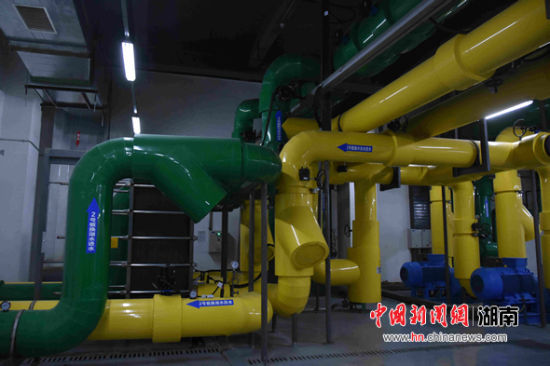 在數(shù)據(jù)中心一樓的冷凍站,記者看到各種顏色的通水管道交錯(cuò)分布,最后都與一個(gè)約三四米高、黑色網(wǎng)狀的設(shè)備相連。從東江湖深層抽上來的低溫湖水,與在機(jī)房吸收熱量后的高溫水在此進(jìn)行熱交換處理后,經(jīng)密閉管道排放至東江湖下游。