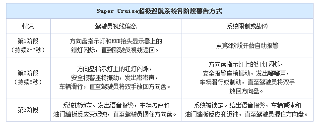 Super Cruise超級巡航系統(tǒng)在駕駛員視線偏離或系統(tǒng)故障的時(shí)候都會分階段地向駕駛員發(fā)出警示,提示駕駛員接管車輛,具體各階段車輛的警示方式可參看下表。