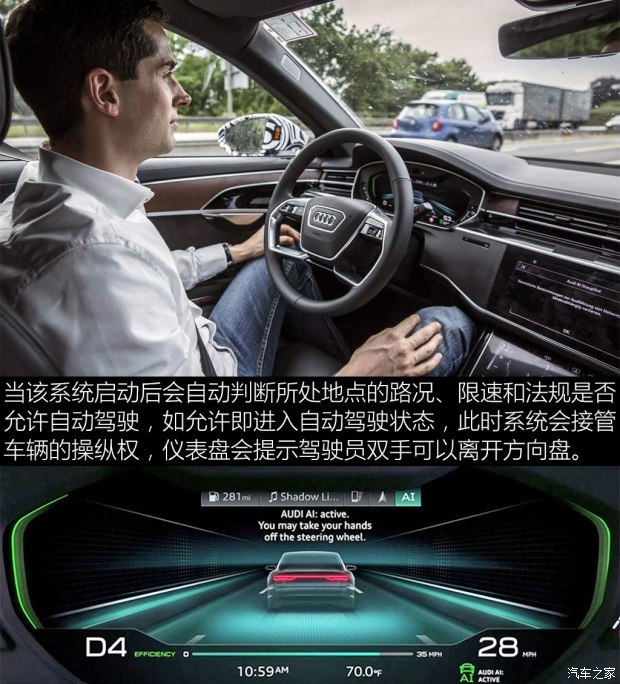 奧迪全新A8在去年秋季在德國上市,該車搭載了一套Level3自動駕駛系統(tǒng),并命名為“Audi AI”。全新A8可以在復(fù)雜道路交通狀況下,以低于37mph(約60km/h)的車速自動駕駛,完全解放駕駛員雙手。全新A8具備ACC自適應(yīng)巡航系統(tǒng)以及車道保持系統(tǒng),當(dāng)車速高于37mph時(shí),這兩個(gè)系統(tǒng)可以起作用實(shí)現(xiàn)駕駛輔助功能。
