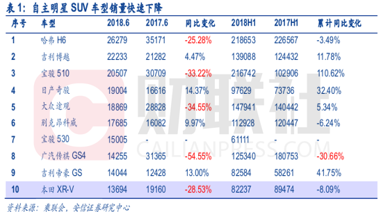 遇到增長(zhǎng)瓶頸的SUV車企,遠(yuǎn)不止是長(zhǎng)城汽車一家。安信證券統(tǒng)計(jì)了2018年上半年SUV銷量前十的車型與去年同比的情況,有五款車型六月出現(xiàn)同比大跌。其中有三款自主主力車型,如哈弗H6、寶駿510和廣汽傳祺GS4,廣汽傳祺GS4上半年以來(lái)累計(jì)同比下跌30.66%。