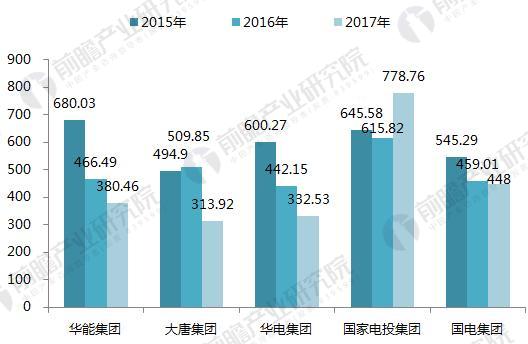 2017年,華能集團供電煤耗最低,完成300.11克/千瓦時,同比下降2.24克/千瓦時。國家能源集團供電煤耗同比降低2.8克/千瓦時,下降數(shù)量最為明顯,完成307.9克/千瓦時。華電集團供電煤耗完成300.8克/千瓦時,同比減少2.3克/千瓦時。國家電投集團供電煤耗同比下降2.25克/千瓦時,完成302.65克/千瓦時。大唐集團供電煤耗完成305.28克/千瓦時,同比降低1.57克/千瓦時。