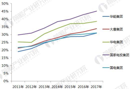 圖表6:2011-2017年舊五大發(fā)電集團清潔能源裝機比重變化情況(單位:%)
