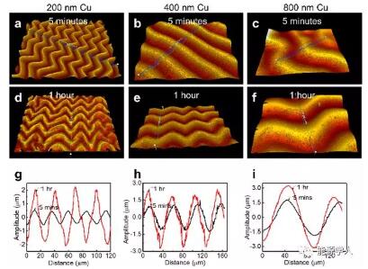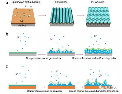 金屬電化學(xué)沉積產(chǎn)生壓應(yīng)力是一個被廣泛觀測到的事實(例如鋅,錫等),同時軟基材料上的金屬薄膜在壓應(yīng)力下會失穩(wěn)產(chǎn)生褶皺得以釋放應(yīng)力有著大量的研究(其中姜漢卿教授十幾年前曾利用這個機(jī)制研究了基于單晶硅的柔性可拉伸電子器件)?墒墙饘黉囋陔娀瘜W(xué)沉積中是否也產(chǎn)生壓應(yīng)力還是一個未被探索的問題。本文作者通過銅/PDMS軟基結(jié)構(gòu)發(fā)現(xiàn),金屬鋰在沉積過程中也會產(chǎn)生壓力,而失穩(wěn)釋放壓應(yīng)力可以有效控制枝晶產(chǎn)生。通過光學(xué)顯微鏡觀察,作者發(fā)現(xiàn)鋰沉積過程會使銅膜表面有規(guī)律的皺褶,皺褶由一維變?yōu)槎S,波長不變,振幅變大。這個皺褶行為可以用理論模型完美描述。這個實驗證明了鋰沉積過程中確實有壓應(yīng)力產(chǎn)生,而且這個壓應(yīng)力可以被釋放。