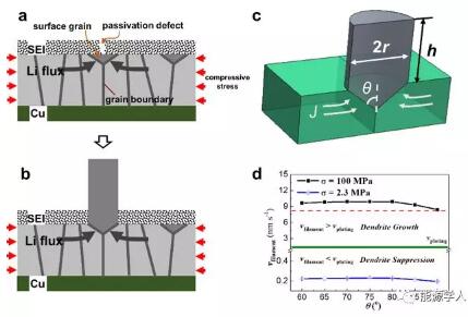 同時本文作者還提出了基于壓應(yīng)力、表面鈍化、表面缺陷和鋰高擴(kuò)散系數(shù)假設(shè)的理論模型。該模型可以很好解釋鋰枝晶生長的原因,預(yù)測鋰枝晶生長速度以及給出防止鋰枝晶產(chǎn)生的力學(xué)設(shè)計策略。