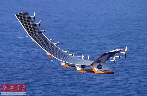 美國航空航天局研發(fā)的“太陽神”太陽能無人機試飛資料圖,翼展達到了創(chuàng)紀(jì)錄的78米,該機已于2003年因意外故障墜入太平洋。