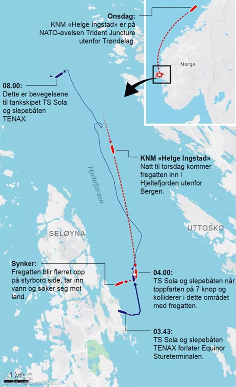 挪威時(shí)間11月8日凌晨4時(shí)左右,在挪威第二大城市卑爾根以北海域耶爾特峽灣發(fā)生了一件對(duì)挪威海軍來說損失非常慘重的事件。剛參加完北約2018軍演的挪威海軍護(hù)衛(wèi)艦“海爾格·英斯塔”號(hào)(KNM Helge Ingstad F313),由挪威中部城市特隆赫姆海域南下返回母港過程中,與一艘懸掛馬耳他旗的阿弗拉型 (Aframax) 油輪(Sola TS)發(fā)生碰撞。 碰撞導(dǎo)致驅(qū)逐艦艦身嚴(yán)重進(jìn)水, 因無法及時(shí)排水,護(hù)衛(wèi)艦面臨沉沒危險(xiǎn),挪威海軍只能將軍艦拖帶至岸邊,在拖輪協(xié)助下坐底軍艦并頂入岸邊防止艦身滑入深水區(qū)域。油輪則只遭受了輕微損傷。目前救援行動(dòng)還在繼續(xù)。