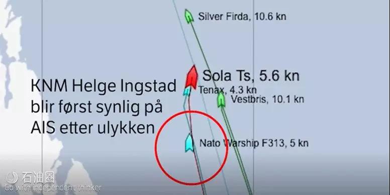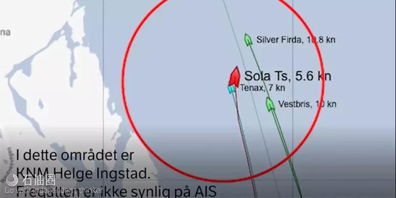 現(xiàn)代航運(yùn)系統(tǒng)一般采用船舶自動(dòng)識(shí)別系統(tǒng)AIS (Automatic Identification System)探詢附近目標(biāo),避免發(fā)生碰撞。AIS系統(tǒng)開啟狀態(tài)的船舶可以在marine traffic的數(shù)據(jù)庫中實(shí)時(shí)查詢定位信息。對(duì)于超過一定噸位的民用船舶來說,國際海事組織規(guī)定航行船舶的AIS必須開啟,但此規(guī)定對(duì)于軍用艦船尤其是作戰(zhàn)艦艇則無效。挪威海軍在撞船事故新聞發(fā)布會(huì)上并未對(duì)當(dāng)時(shí)AIS的運(yùn)行狀態(tài)做出回應(yīng)。但我們從新聞網(wǎng)站中公布的信息可以看出來油輪開過撞船地點(diǎn)之后護(hù)衛(wèi)艦才首次以“北約戰(zhàn)艦”的名字出現(xiàn)在marine traffic系統(tǒng)中。