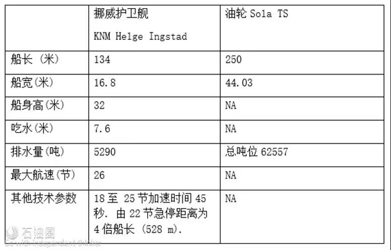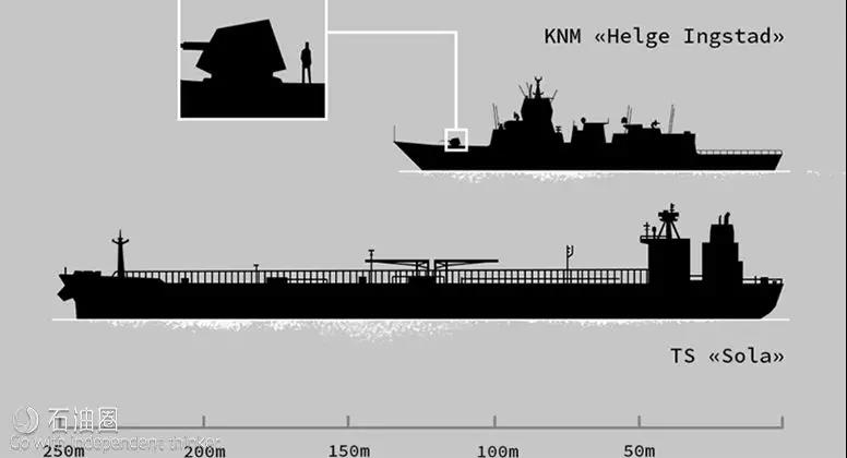 挪威海軍五艘南森級(jí)主力護(hù)衛(wèi)艦之一的“海爾格·英斯塔”號(hào)排水量為5290噸,船長134米。油輪Sola TS為阿弗拉型油輪,該型油輪滿載排水量超過10萬噸,船長為250米,寬44.03米。從網(wǎng)上查到的一些兩船相關(guān)信息見下表。兩條船的相對(duì)尺度見下圖。