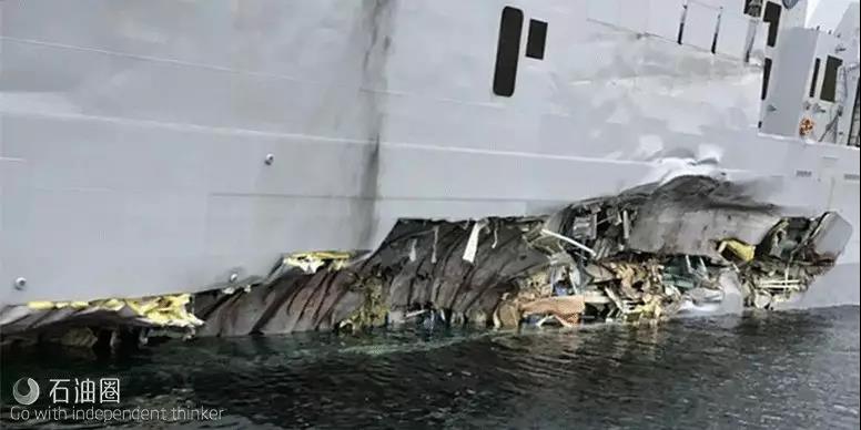 目前并無船舶碰撞細(xì)節(jié)參數(shù),但根據(jù)媒體報(bào)道,該油輪為滿載出港狀態(tài),則保守估計(jì)碰撞時(shí)重量超過10萬噸,為驅(qū)逐艦的20倍之多。這大概相當(dāng)于一個(gè)成年人和剛出生嬰兒的區(qū)別。
