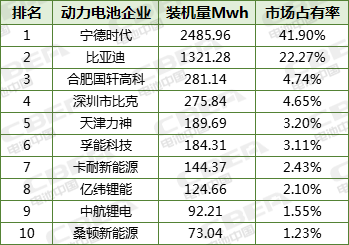 從電池企業(yè)來(lái)看,寧德時(shí)代以2.49Gwh的動(dòng)力電池裝機(jī)量位列第一,占10月總裝機(jī)量的41.9%;比亞迪緊隨其后,動(dòng)力電池裝機(jī)量為1.32Gwh,占比22.27%,合肥國(guó)軒高科排名第三,動(dòng)力電池裝機(jī)量為0.28Gwh,占比4.74%。同上月相比,排名前兩位的動(dòng)力電池企業(yè)沒(méi)有發(fā)生變化,行業(yè)龍頭企業(yè)地位依舊穩(wěn)固。