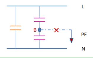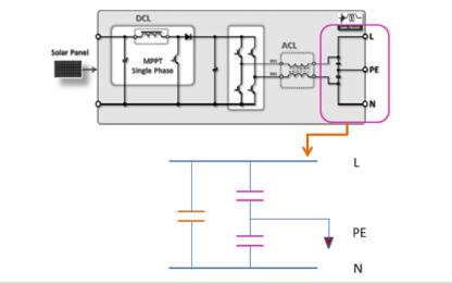 上圖中,L-PE以及N-PE間的電容被稱為Y電容,L-N間的電容被稱為X電容,X電容與Y電容也被叫做安全電容。做此設(shè)計(jì)的出發(fā)點(diǎn),就是利用電容隔直通交的特性,把外界干擾和內(nèi)部產(chǎn)生的一些高頻輻射,通過電容——地線的路徑進(jìn)行濾除,從而增加逆變器的電磁兼容性。