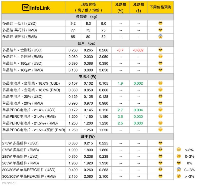 不僅單晶PERC需求火熱,多晶也因為先前開工率持續(xù)下降而使得近期供應(yīng)略為緊張,電池廠紛紛抬高12月的多晶電池片報價,國內(nèi)報價來到每瓦0.88元人民幣上下、海外價格則希望漲至0.107元美金以上。目前組件廠尚未接受多晶電池片的上漲,實際情形預(yù)期后續(xù)幾天會較明朗。