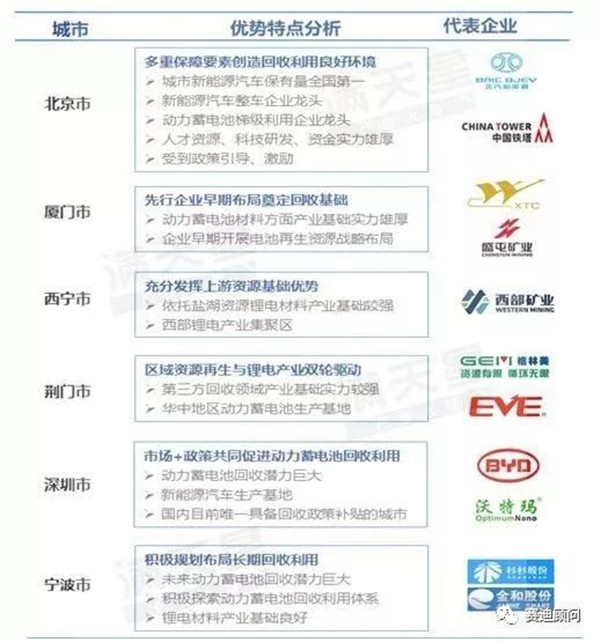 在市場(chǎng)需求及政策的推動(dòng)下,北京市、深圳市、廈門市、寧波市、西寧市、荊門市等先行城市,依托自身市場(chǎng)、企業(yè)基礎(chǔ)、產(chǎn)業(yè)配套等獨(dú)特優(yōu)勢(shì),在動(dòng)力蓄電池回收利用領(lǐng)域上開展了早期布局工作,并積累了實(shí)踐經(jīng)驗(yàn)。