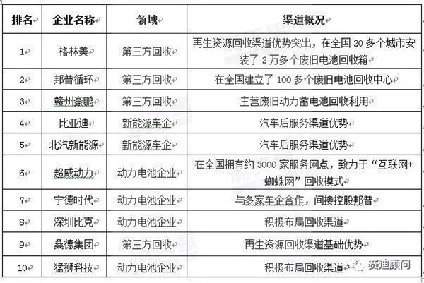 動(dòng)力蓄電池回收渠道企業(yè)TOP 10