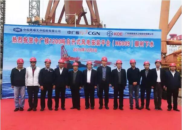 12月8日,中船集團旗下黃埔文沖公司為廣東精銦海洋工程股份有限公司建造的中廣核1200噸自升式風(fēng)電安裝平臺(H6009)在其龍穴廠區(qū)下水,計劃2019年初交付。