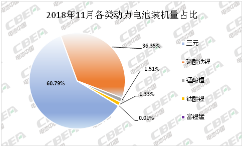 從動力電池類型來看,2018年11月,三元電池裝機(jī)量為5.42GWh,主要配套在新能源乘用車和新能源專用車上,配套的裝機(jī)量占比分別為89.37%和10.63%;磷酸鐵鋰電池裝機(jī)量為3.24GWh,配套在新能源客車上的裝機(jī)量占比為63.06%,配套在新能源乘用車和新能源專用車上的裝機(jī)量占比分別為17.54%和19.4%;錳酸鋰電池裝機(jī)量為0.14GWh;鈦酸鋰電池裝機(jī)量為0.12GWh。值得關(guān)注的是,本月出現(xiàn)了富鋰錳電池,由浙江遨優(yōu)動力系統(tǒng)有限公司提供,配套在純電動專用車上,裝機(jī)量約0.0009GWh。