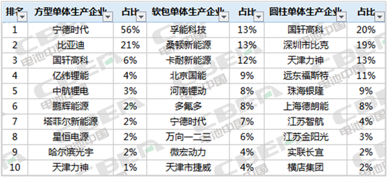2018年11月各類單體電芯外形生產(chǎn)企業(yè)TOP10排名