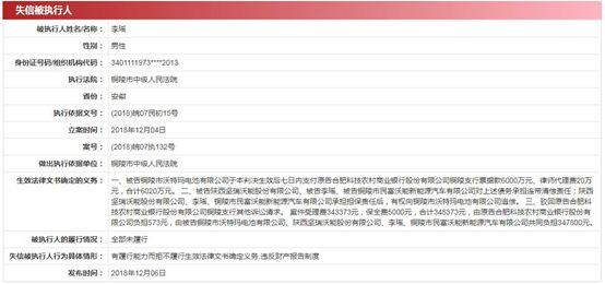 本次被列入失信被執(zhí)行人名單,緣于銅陵市沃特瑪與合肥科技農(nóng)村商業(yè)銀行發(fā)生經(jīng)濟(jì)糾紛。根據(jù)生效法律文書確定的義務(wù),被告銅陵沃特瑪應(yīng)于判決生效后七日內(nèi)支付原告合肥科技農(nóng)村商業(yè)銀行銅陵支行票據(jù)款6000萬元、律師代理費(fèi)20萬元,合計(jì)6020萬元。陜西堅(jiān)瑞沃能股份有限公司、李瑤、銅陵市民富沃能新能源汽車有限公司承擔(dān)連帶清償責(zé)任,其還將共同承擔(dān)案件受理費(fèi)等在內(nèi)的34.78萬元。